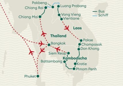 Das vor allem bei Sonnenanbetern geschätzte Reisedomizil mit seinen rund 500 Inseln ist ein scheinbarer Widerspruch aus dem Grossstadttrubel Bangkoks und einem idyllischen Leben an der Küste. Ein Besuch auf dem schwimmenden Markt offeriert die gesamte Vielfalt thailändischer Küche. Für Entspannung beim Beobachten des Treibens sorgt eine Klongfahrt, bevor der Königspalast samt Smaragd-Buddha-Tempel als weiteres Thailand-Highlight lockt. Bei einer Rundreise durch Thailand erkunden Sie naturbelassene, entlegene Winkel genauso wie die pulsierende Grossstadt Bangkok – mit optionaler Badeverlängerung. Besuchen Sie die Highlights und lassen Sie sich in deren Bann ziehen.